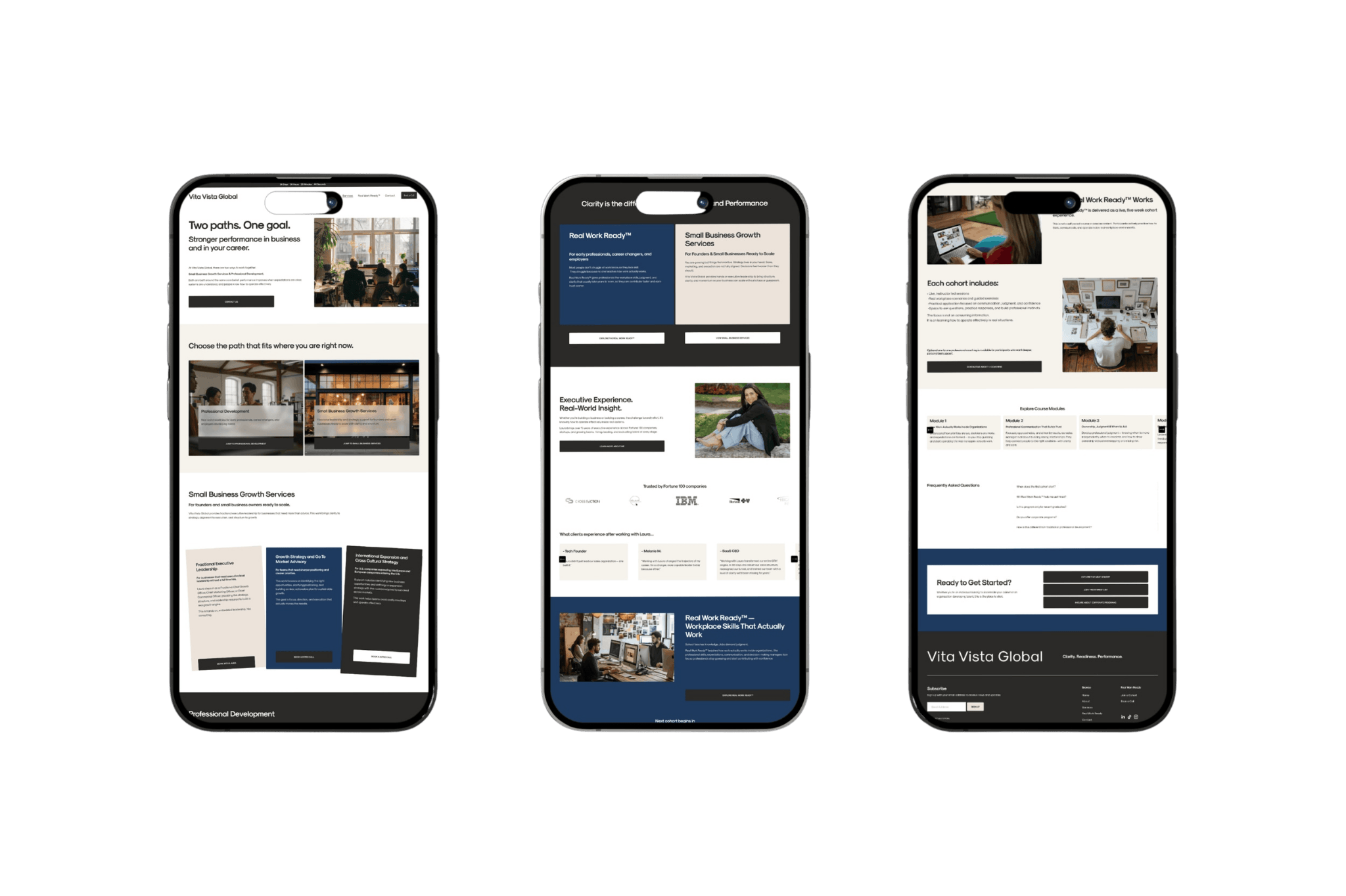 Vita Vista Global’s website was designed to clearly position two core offerings: strategic leadership support for founders and the Real Work Ready™ program for professionals. Built on Squarespace, the site focuses on clarity, credibility, and guiding users to the right path quickly.